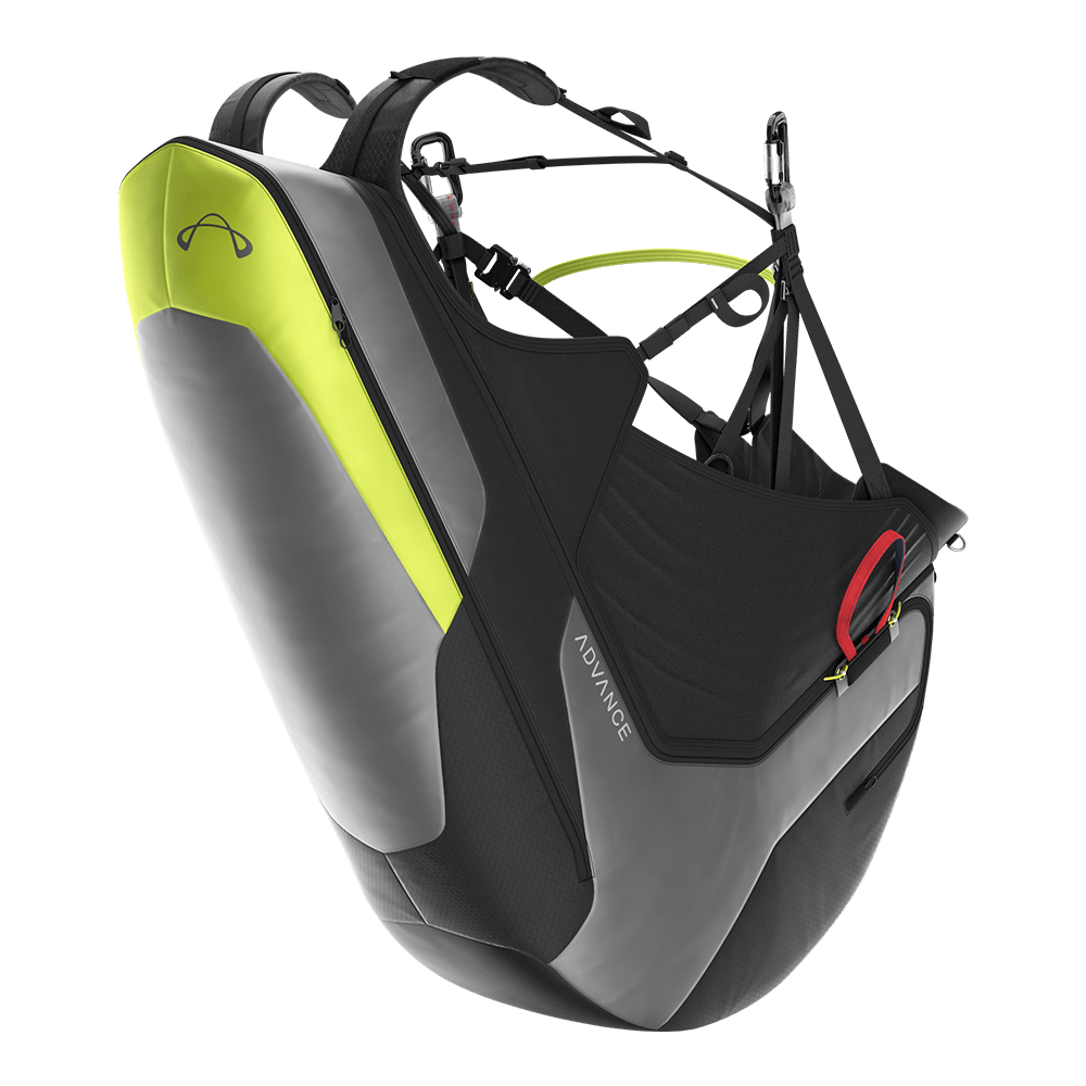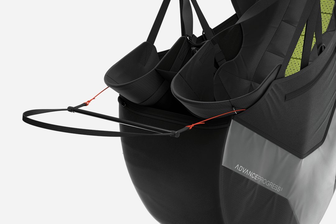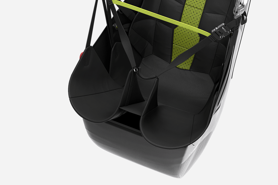 The ergonomically-shaped PROGRESS 3 seat surface automatically takes up the pilot’s body shape in flight, substantial Legpads and ingenious lower back support also contribute to very comfortable hold. As a rucksack, well-fitting shoulder straps and a breathable mesh back section also provide maximal carrying comfort.